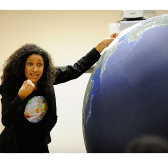 La Planète est une conférence scientifique, assez vite délirante, présentée par une (ou deux) « planétologue(s) » – africaine(s) –, assistée(s) d’un invraisemblable outil pédagogique : un énorme globe terrestre gonflable. D’une manière ludique, les élèves peuvent s’emparer de l’objet et observer le monde à l’envers. Voire « penser » le monde à l’envers ... Et s’inquiéter !